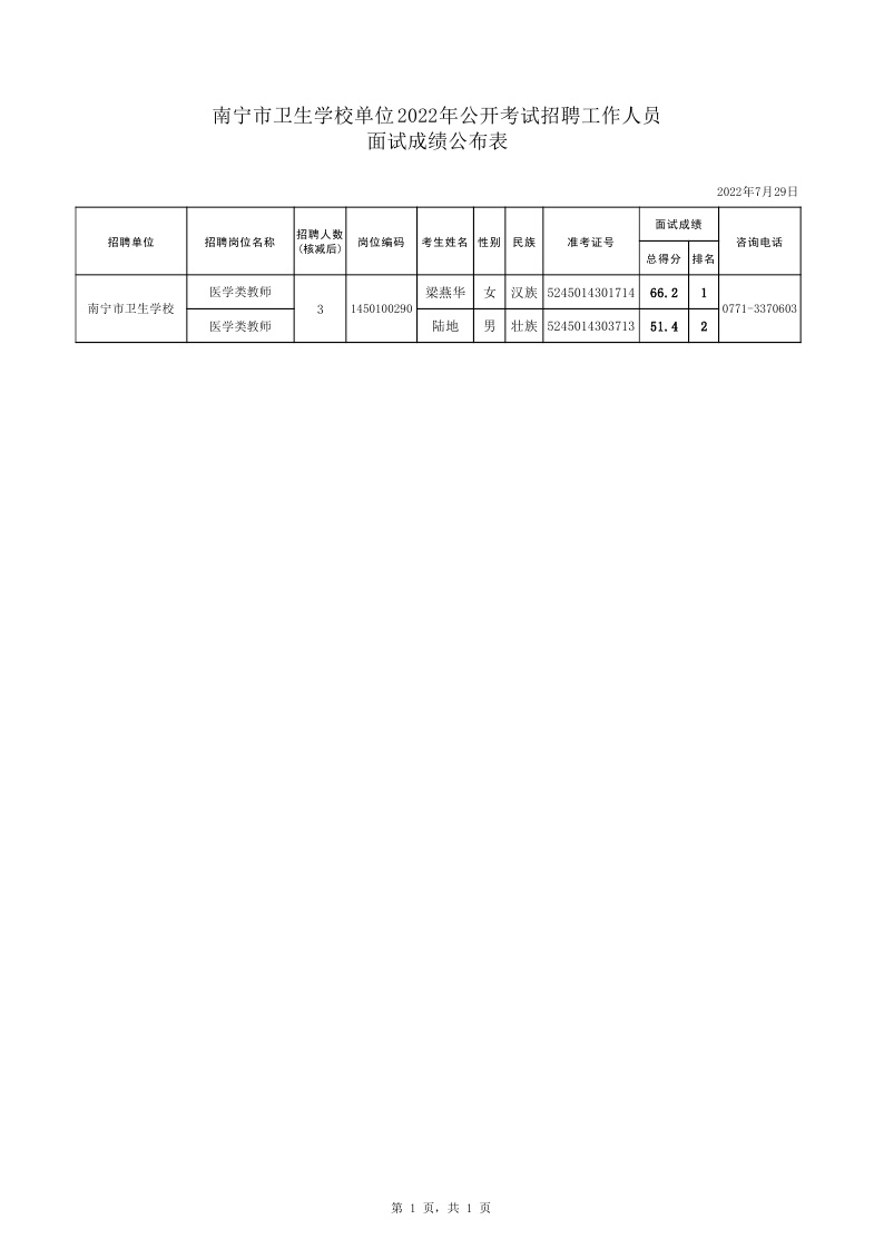南宁市卫生学校2022年公开考试招聘工作人员面试成绩公布表