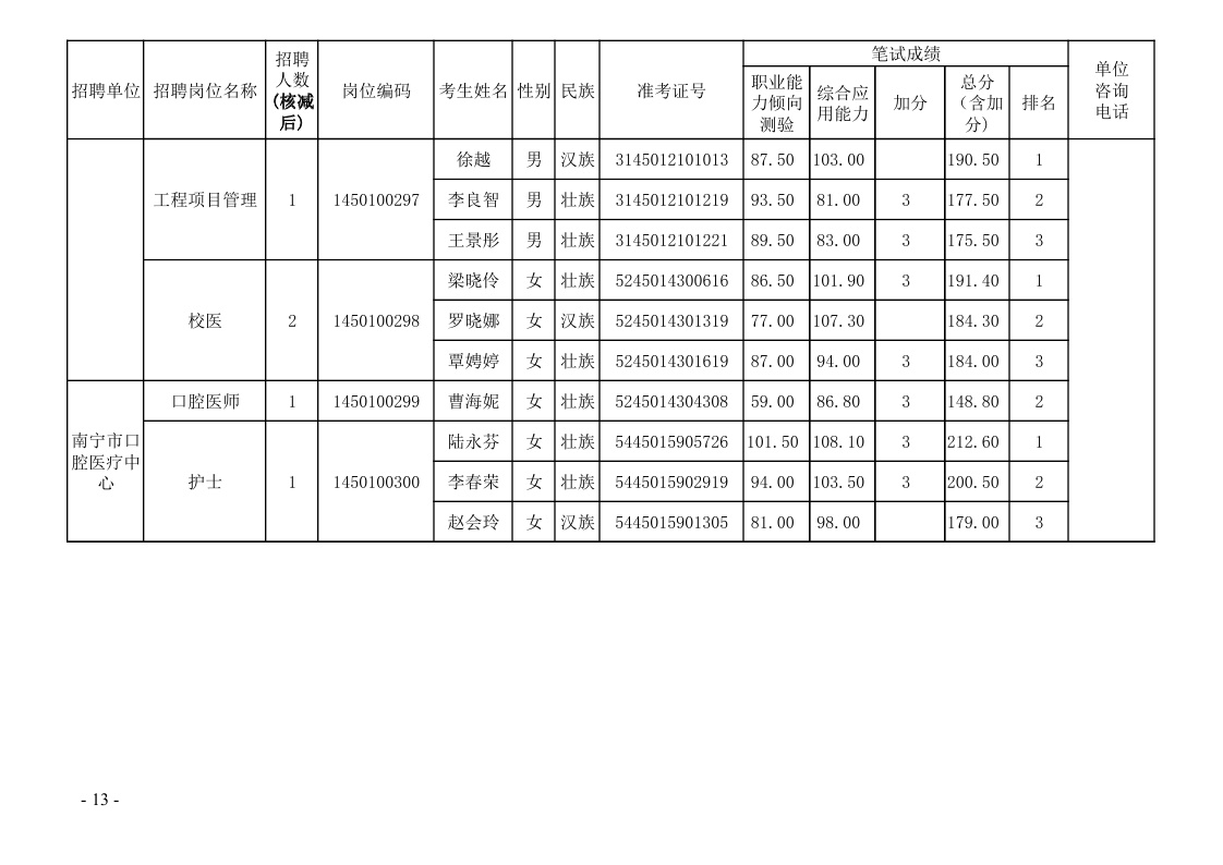 南宁市卫生学校2022年公开考试招聘工作人员面试成绩公布表