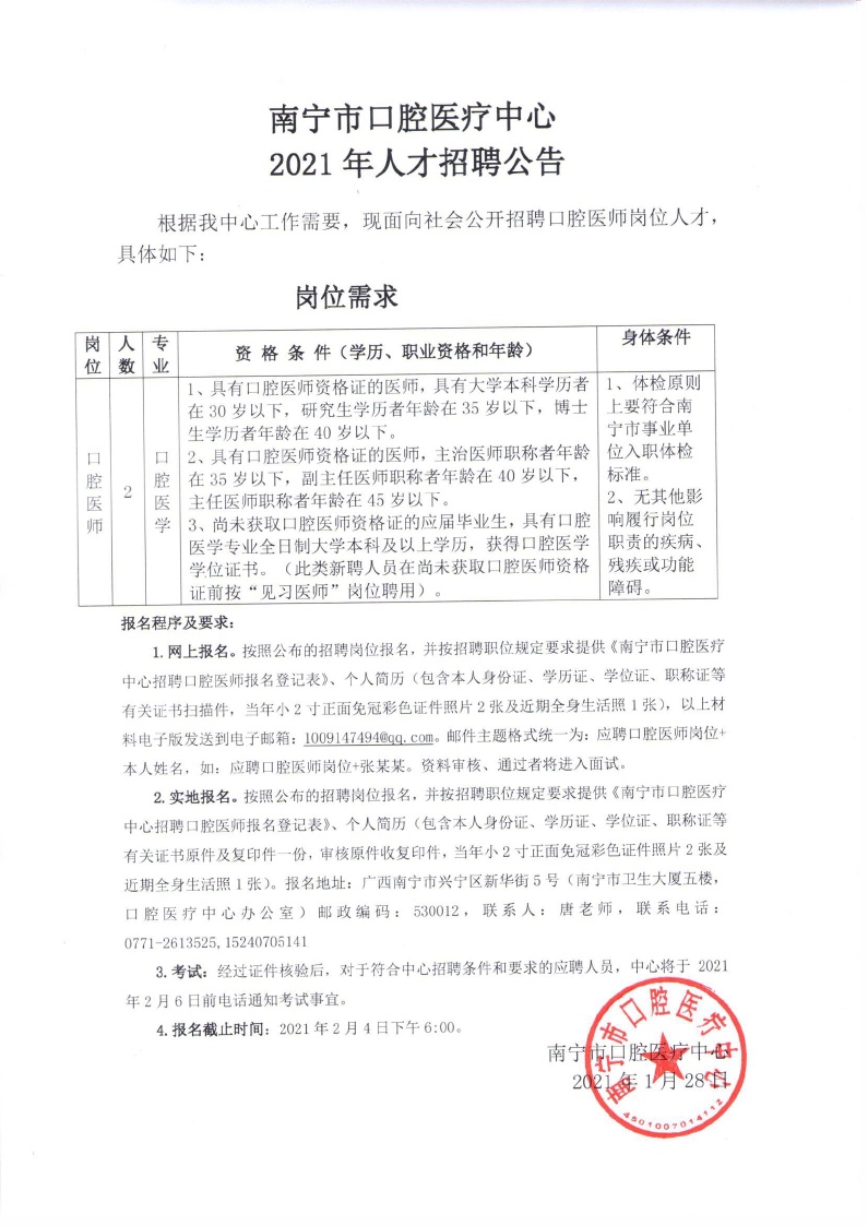 2021年南宁市口腔医疗中心公开招聘口腔医师公告