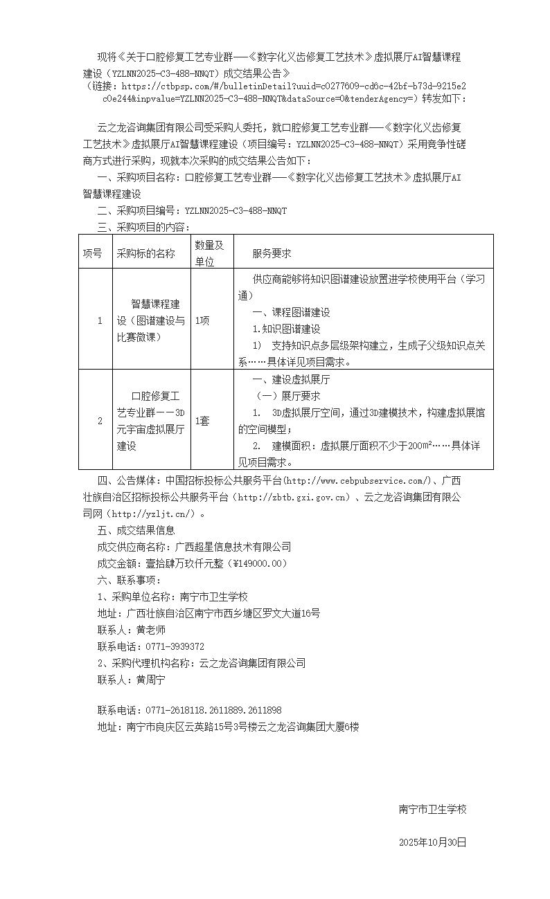 关于口腔修复工艺专业群---《数字化义齿修复工艺技术》虚拟展厅AI智慧课程建设成交结果公告