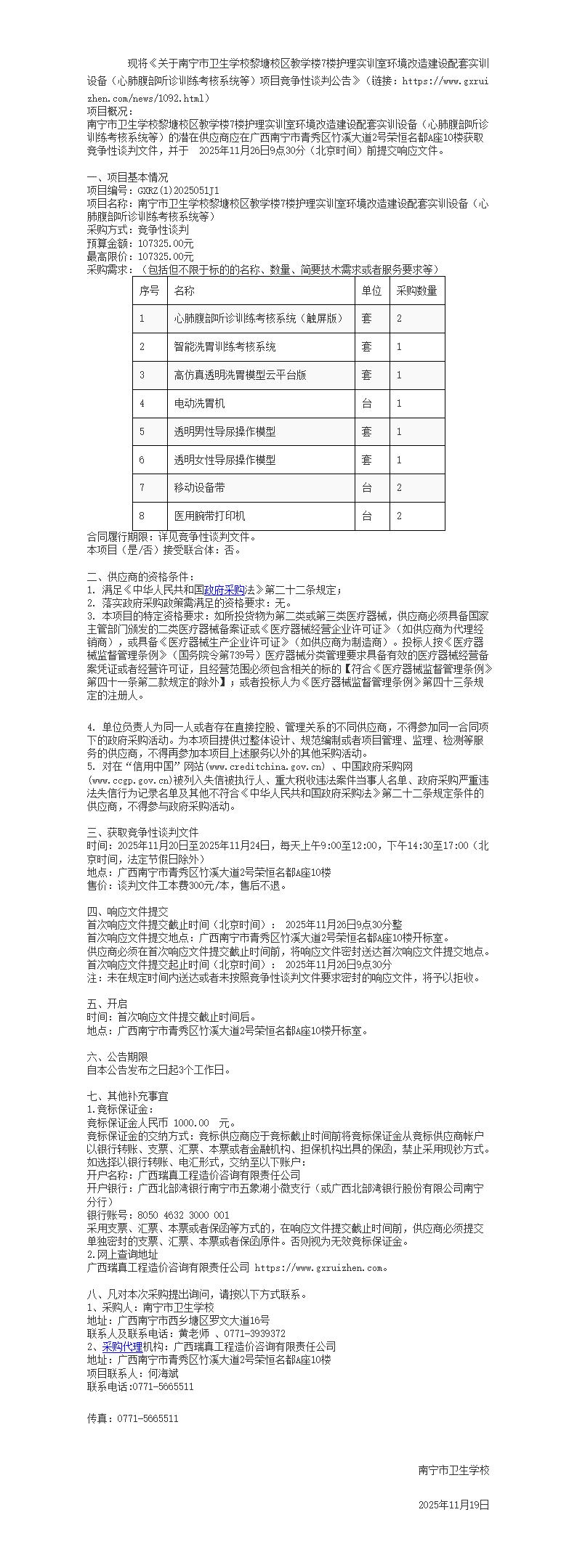 关于南宁市卫生学校黎塘校区教学楼7楼护理实训室环境改造建设配套实训设备项目竞争性谈判公告