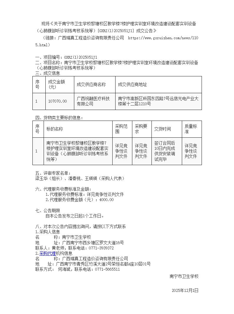 关于南宁市卫生学校黎塘校区教学楼7楼护理实训室环境改造建设配套实训设备成交公告
