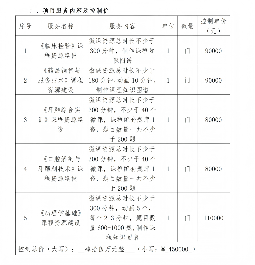 为体现职业教育课程的“实践性、开放性”等特点,开展《临床检验》、《药品销售与服务技术》、《牙雕综合实训》、《口腔解剖与牙雕刻技术》及《病理学基础》等5门课程教学资源建设。建设内容包括课程资源、课程图谱建设,以文本、图片、动画、视频、PPT等形式展示,支持线上教学和线上线下混合教学。本次公开征集旨在全面了解当前课程资源建设服务的市场状况、技术标准、服务模式及价格水平,为我校后续科学、合理地制定采购需求提供决策依据。