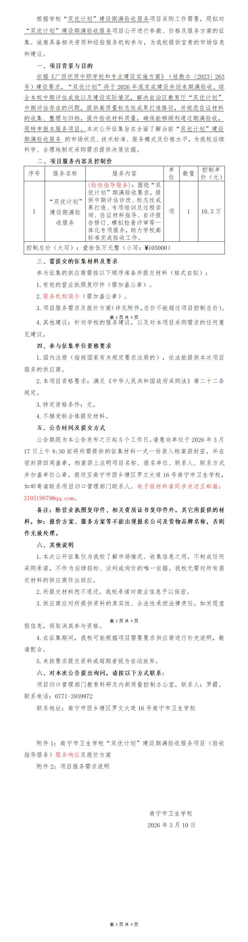 南宁市卫生学校关于“十五五”规划编制咨询 项目参数、价格及服务方案公开征集公告