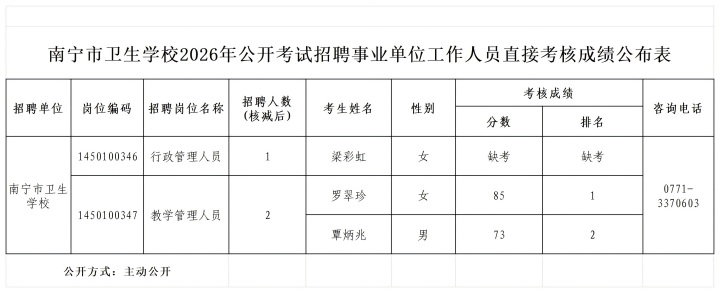 南宁市卫生学校2026年公开考试招聘事业单位工作人员直接考核成绩公布表