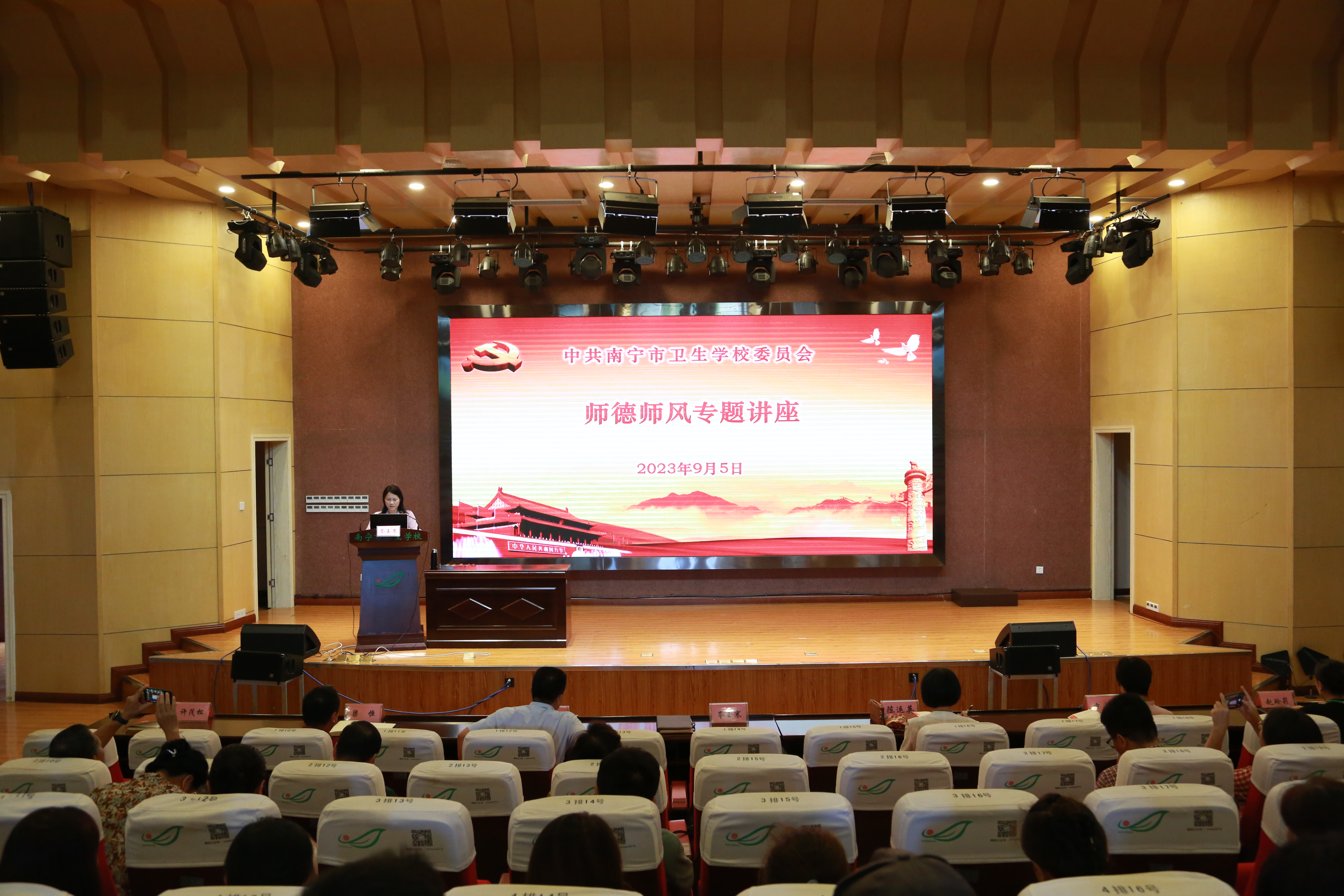 9月5日下午,南宁市卫生学校邀请了广西师范大学客座教授、广西师范大学创业导师、南宁市委宣讲团特聘教授覃存民为全体教职工开展了一堂主题为《加强师德师风建设 落实立德树人根本任务》的专题讲座。学校领导班子和全体教职工参加了此次讲座,讲座由学校党委书记岑玉寒主持。