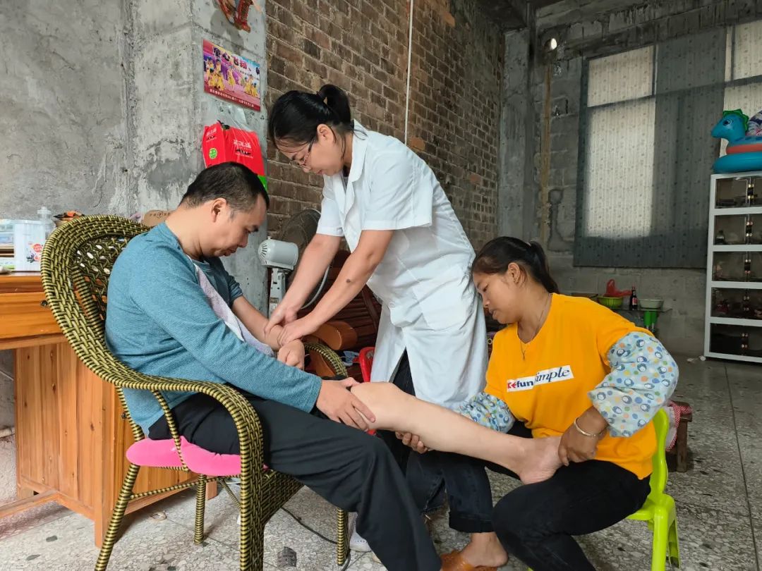 会后,第一书记黄茂懋带领陈运英副书记一行人实地对杨树村7户帮扶脱贫户和防止返贫监测户进行深度回访。陈运英副书记深入村民家中,扫码查看了每户的明白卡,了解他们的生产生活、收入和看病就医等方面存在的困难和问题,与第一书记共同研究探讨解决的办法,鼓励他们勇于战胜困难、坚定信心、勤劳致富,把家园建设得更加美好、更加富裕。同时,发挥后盾单位特色,带领学校康复治疗医师为瘫痪村民做康复治疗,将治疗方法教授给家属,希望他们能在日常生活中坚持做康复治疗以改善病情。