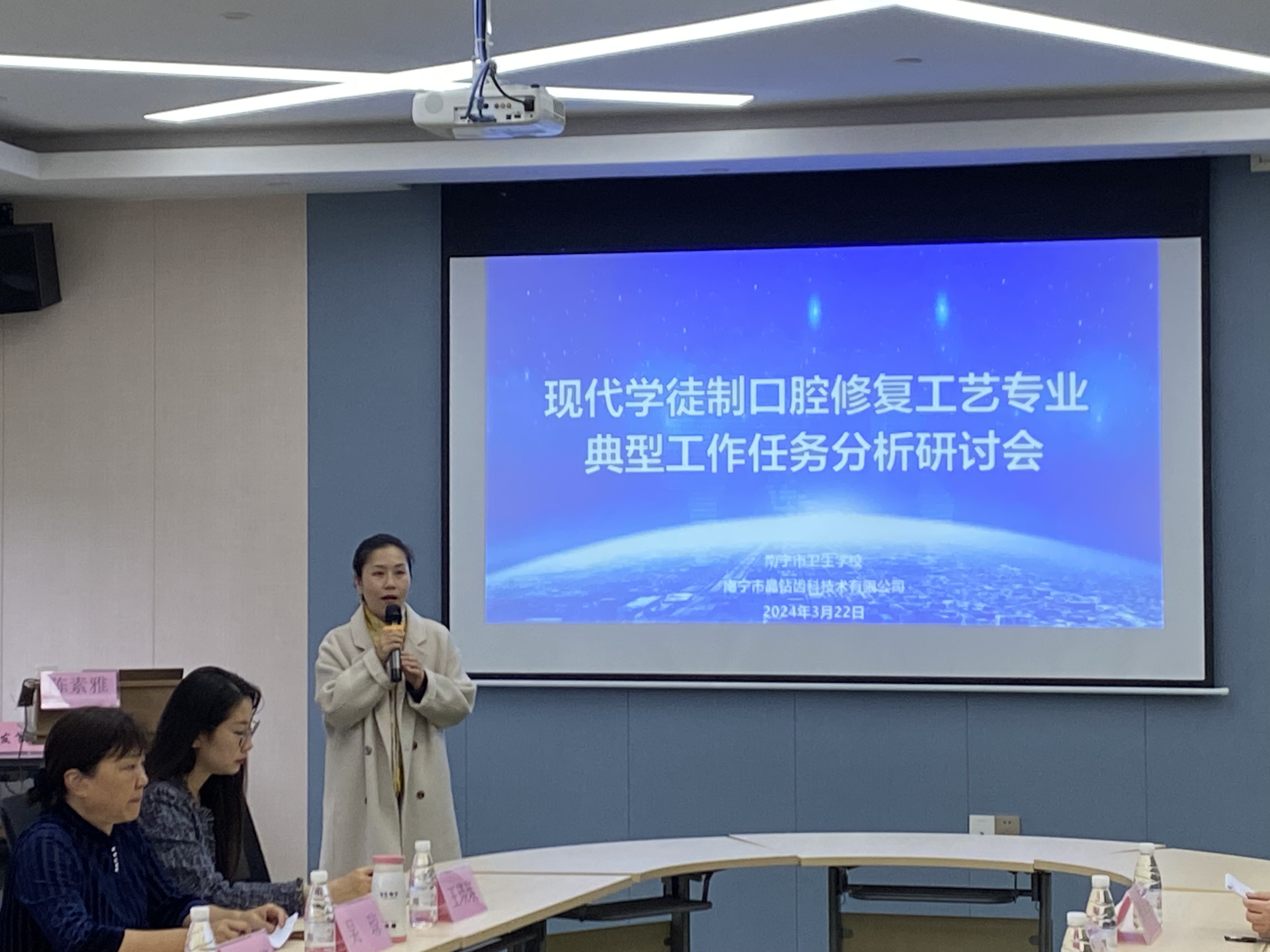 为了更好推进南宁市卫生学校现代学徒制口腔修复工艺专业人才培养,2024年3月22日至23日,南宁市卫生学校开展了两场研讨会,研讨内容为现代学徒制口腔修复工艺专业典型工作任务分析和课程体系构建。会议邀请了复旦大学出版社职业教育双元育人新型活页教材开发指导专家吴琼教授承担会议主持人,来自广州卫生职业技术学院口腔医学院、广东省连州卫生学校的教育专家和南宁市晶钻齿科技术有限公司、深圳市康倍嘉义齿科技有限公司、广州黑格齿科设计中心、广东谱斯达光子科技有限公司等企业实践专家,南宁市卫生学校副校长赵玲莉、教务科科长韦振飞、口腔专业全体专业教师参与会议。