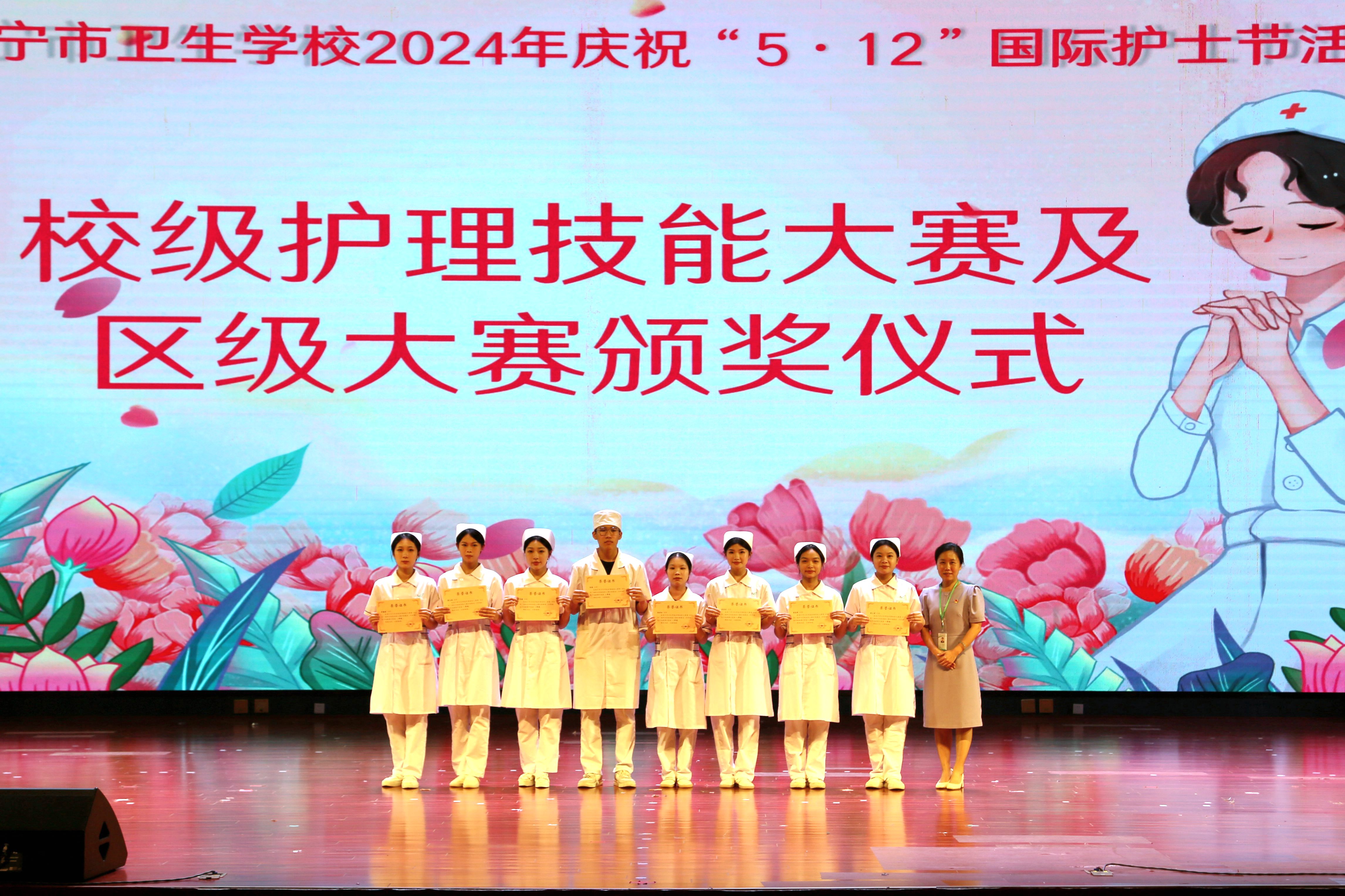 最后,学校还为2024年校级护理技能大赛、全区职业院校技能大赛的获奖选手颁奖,肯定、表彰同学们的辛苦付出,也是对2023级护理专业的同学们的鼓励,希望他们向学姐、学长学习,在专业知识和职业技能上夯实基础,勤学苦练,为自己打下坚实的基础。