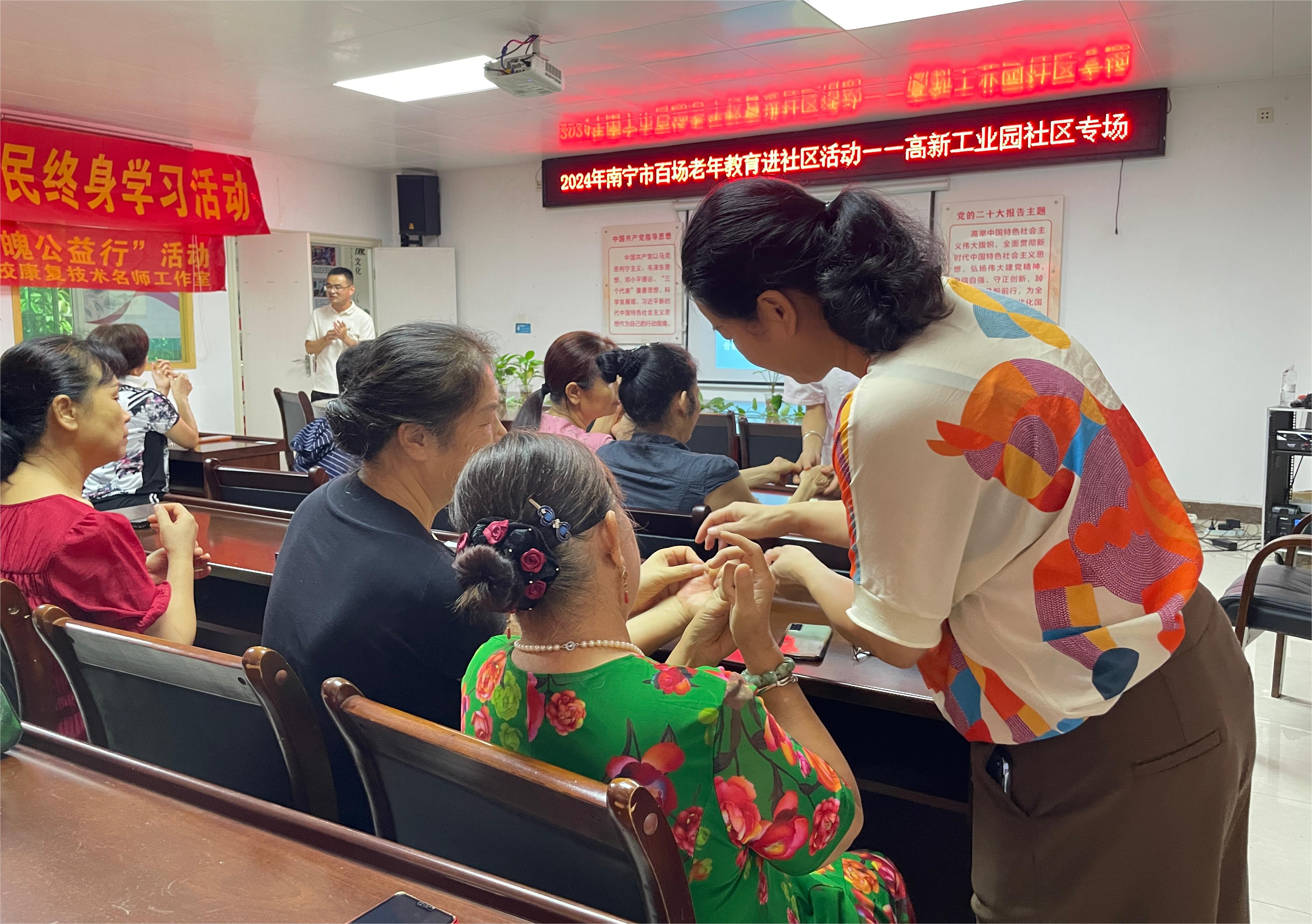 6月25日,中医康复保健教研室主任黄春燕、合和大唐健康管理有限公司黎明老师的团队到南宁市高新工业园社区为老年居民开展手部保健教育。老师们通过简单欢快的“十巧手健康操”,让老年居民迅速掌握了手部保健知识,深受居民喜爱。居民李女士表示:“这个操很简单,跟着老师做一遍就会了,做完手暖暖的,平时在家看电视时也可以做,还可以疏通经络,很适合我们。”