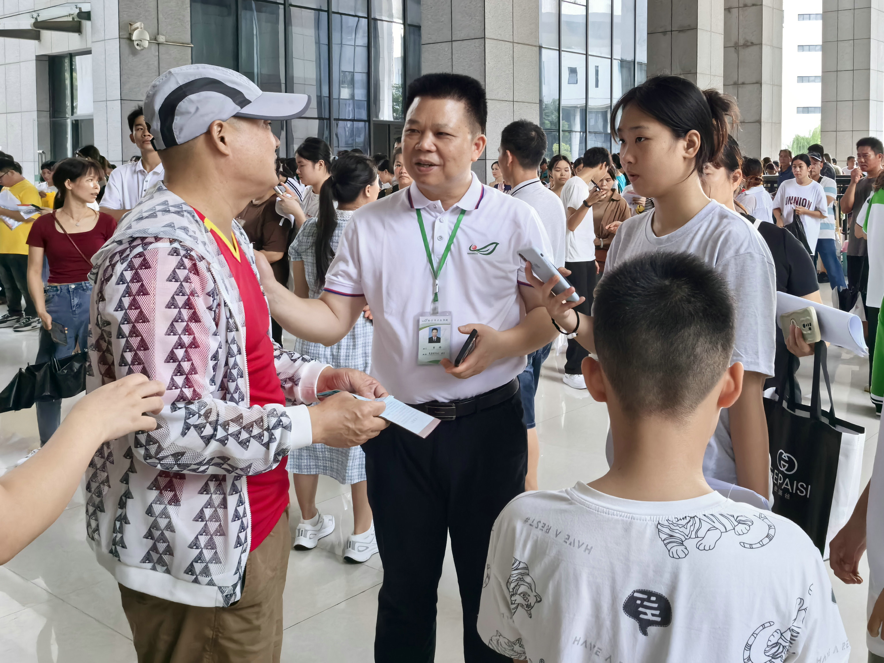 学校领导班子来到校园各个接待点,了解新生报到情况,慰问鼓励工作人员、志愿者,并与新生和家长亲切交流,给他们解疑答惑。