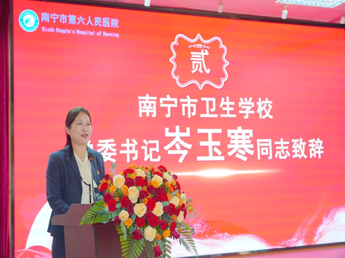 南宁市卫生学校党委书记岑玉寒表示,学校党委以打造“南卫师魂•红烛树人”党建品牌为契机,积极探索“党建引领思政”的育人模式。自去年12月学校和市六医院建立院校合作关系以来,双方建立了深厚情谊,今天思政实践教学基地的成立,是学校、医院双方共谋思政教育发展、拓展“三全育人”新格局的有益探索。基地为学校学生提供更多的实践学习机会,将“思政小课堂”与“社会大课堂”紧密结合起来,让思政课更加生动、鲜活、有感染力,引导学生扣好人生中的第一颗扣子。希望今后能切实发挥思政实践教学基地的桥梁纽带作用,在双方作为教学共建单位的基础上,加强交流合作,汇聚院校合力,做到优势互补、资源共享、相互促进、共同发展。