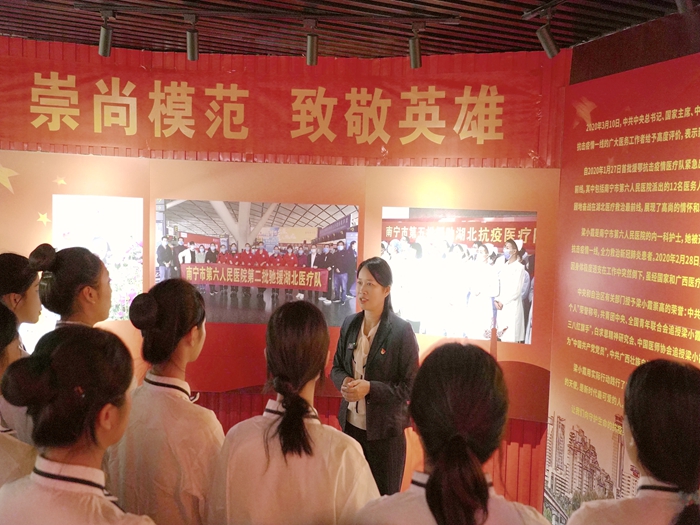 仪式结束后,参加活动的人员共同参观了市六医院的党建文化馆、院史馆、梁小霞烈士纪念馆。南宁市卫生学校24级护理8班学生蔡伊静参观之后备受鼓舞,她表示:“在今天的思政实践活动中,我参观了梁小霞烈士纪念馆,了解到梁小霞的感人事迹,这和在学校上课的感受是完全不一样的。看到这一张张真实的照片,我十分感动,今后我会以梁小霞前辈为榜样,承担起自己作为医护学子的责任!”