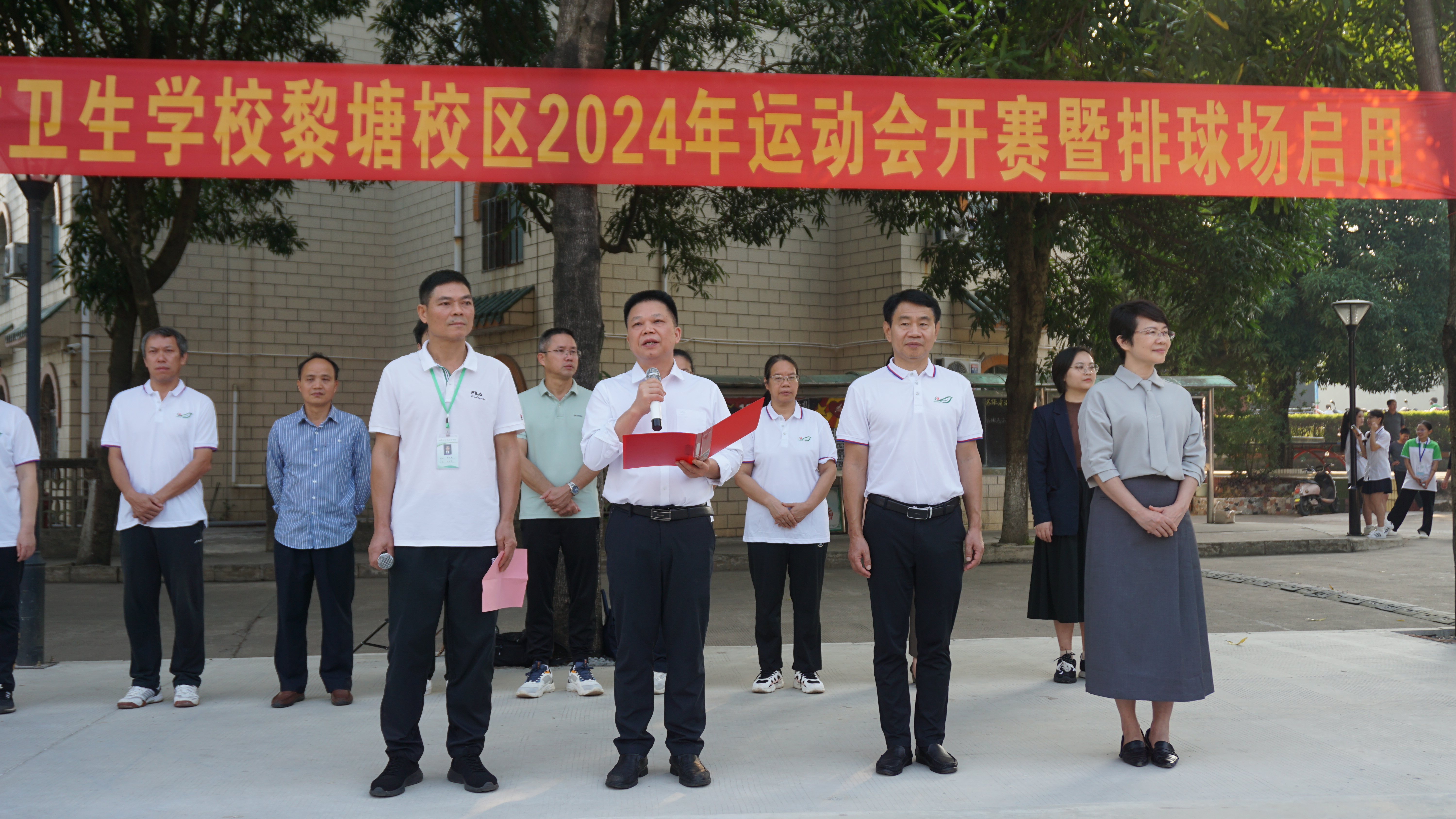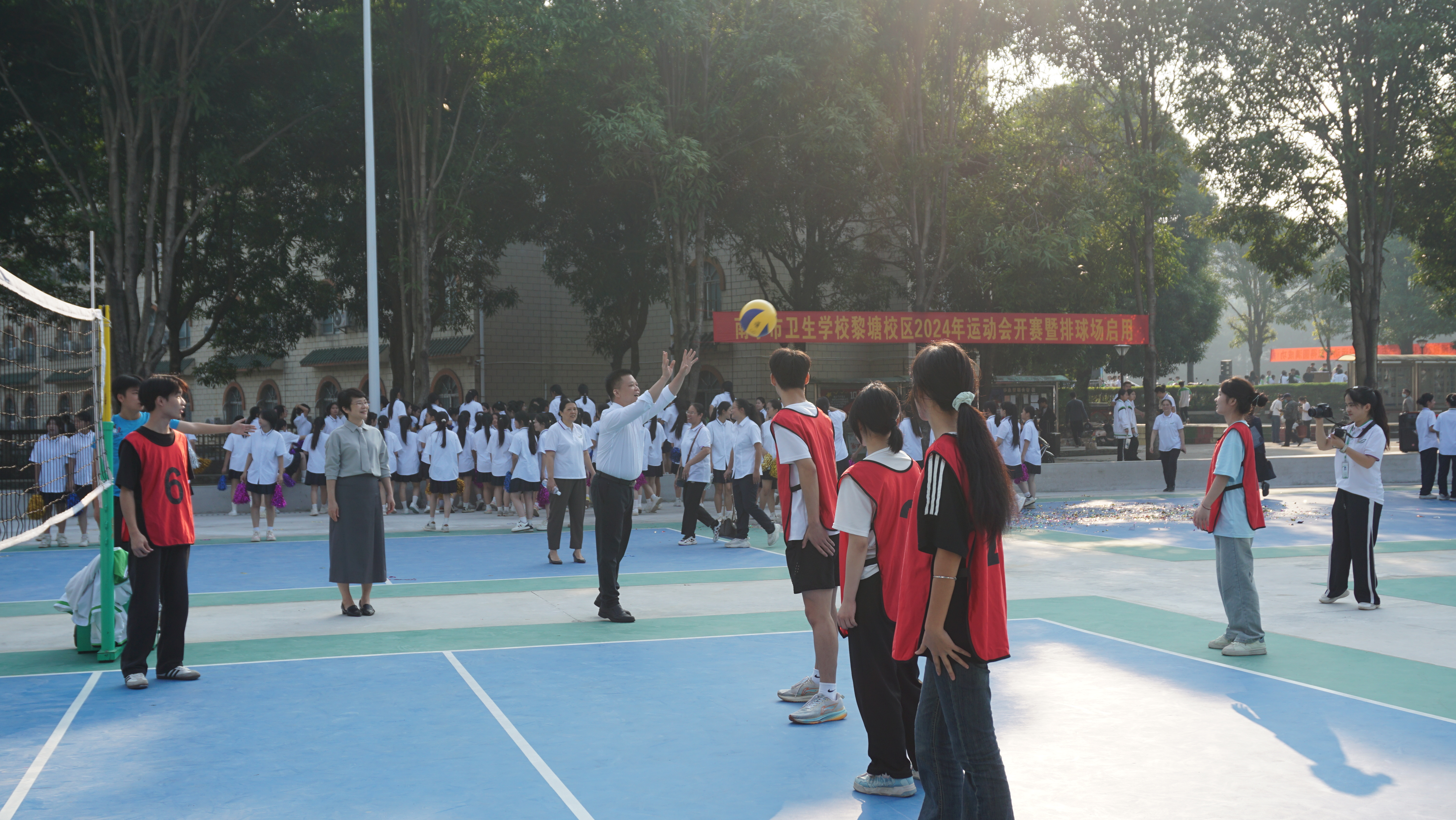 2024年11月14日星期四上午9:00,南宁市卫生学校黎塘校区举行了排球场启用仪式,标志着学校体育设施建设又迈出了重要的一步。学校校长曾伟、副校长许茂松、韦金英、卢青以及黎塘校区中层干部和部分学生参加了此次仪式,共同见证了这一激动人心的时刻。