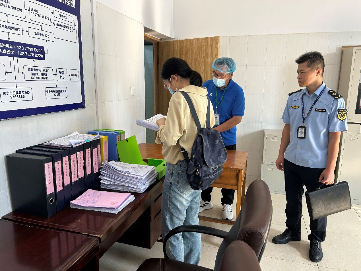 11月13日上午,为落实《自治区教育厅办公室关于召开全区进一步深化整治中小学校园食品安全和膳食经费管理突出问题大排查大整治工作部署视频会议的通知》工作情况,南宁市教育局和南宁市市场监督管理局到南宁市卫生学校联合开展检查。学校后勤部门负责人、食品安全员及管理员陪同检查。