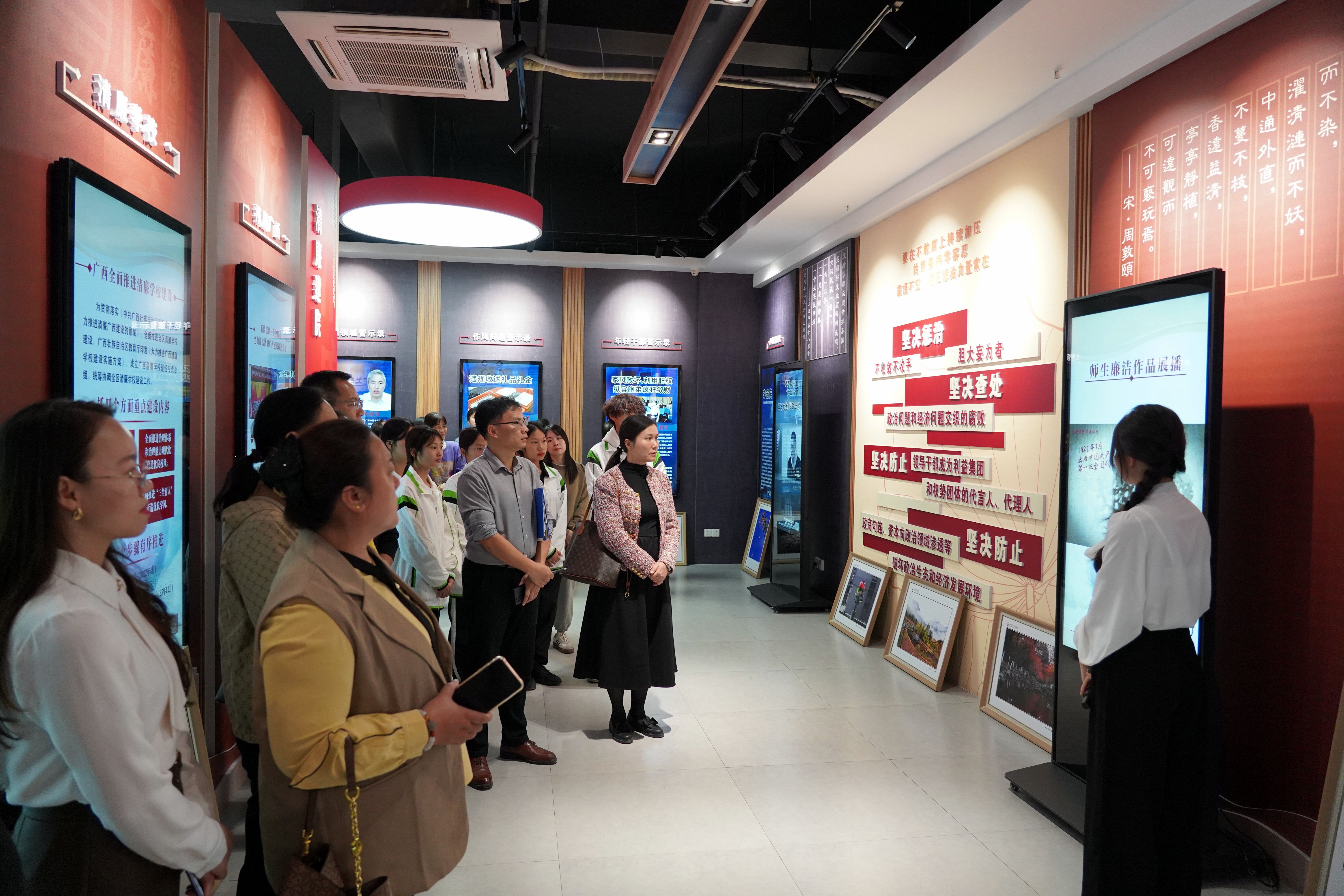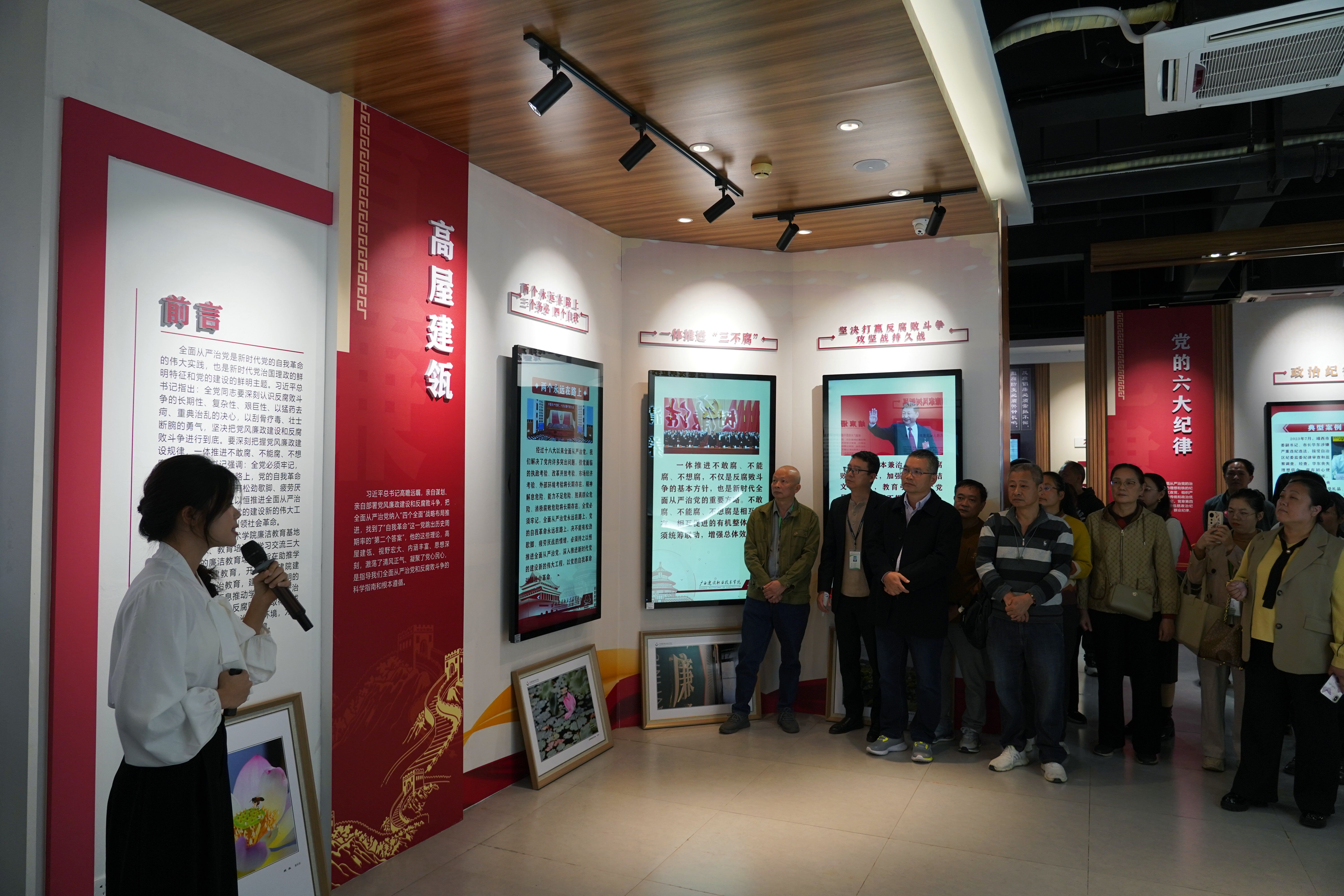 广西建设职业技术学院廉洁教育基地由“高屋建瓴”“六大纪律”“警钟长鸣”“清廉建院”“全面从严治党”“育廉新风”六大展示板块组成。在参观过程中,全体人员在讲解员的引导下,通过聆听讲解,观看图文展示和警示教育微电影等方式,依次参观了警示教育基地各个板块。展厅通过一个个鲜活的案例、一封封真切的忏悔书、一幕幕令人深思的忏悔画面,给全体人员现场上了一堂触动灵魂的警示教育课。从位高权重的政府官员到高校的领导干部,从贪污受贿到滥用职权,这些案例深刻揭示了腐败行为给党和国家、给个人和家庭带来的严重危害,让大家深受震撼,从思想上受到了深深的洗礼,提醒着全体人员要时刻绷紧廉洁自律这根弦,处处防微杜渐、时时警钟长鸣。