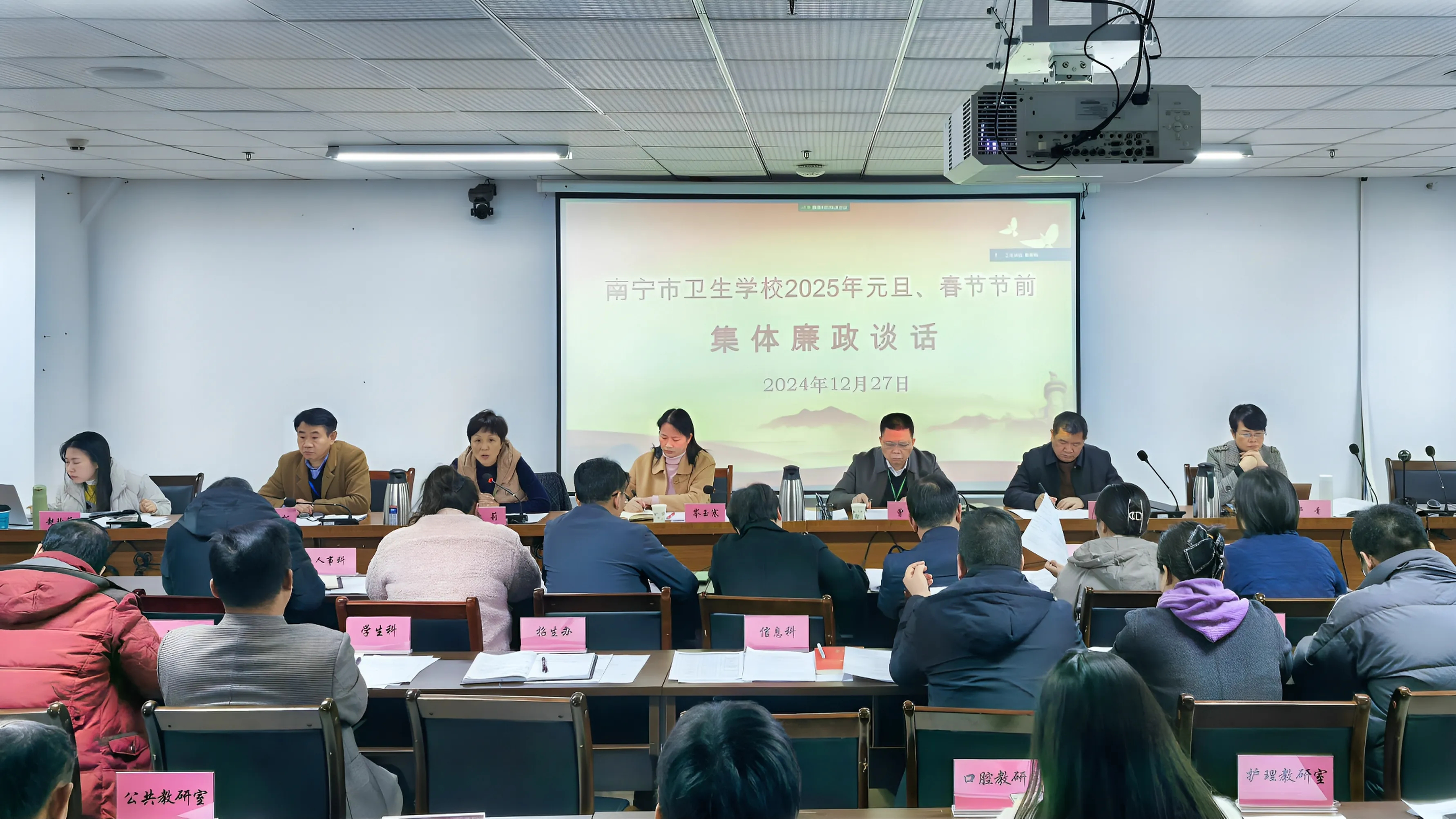 元旦、春节双节将至,为深入贯彻落实中央八项规定及其实施细则精神,扎实推进清廉学校建设,持之以恒正风肃纪,营造廉洁文明、风清气正的节日氛围,12月27日下午,南宁市卫生学校召开2025年元旦、春节节前集体廉政谈话会。学校党委书记岑玉寒出席会议并讲话,校长曾伟主持会议。学校中层及以上领导干部40多人参加会议。学校党委副书记、纪委书记方莉作集体廉政提醒谈话。