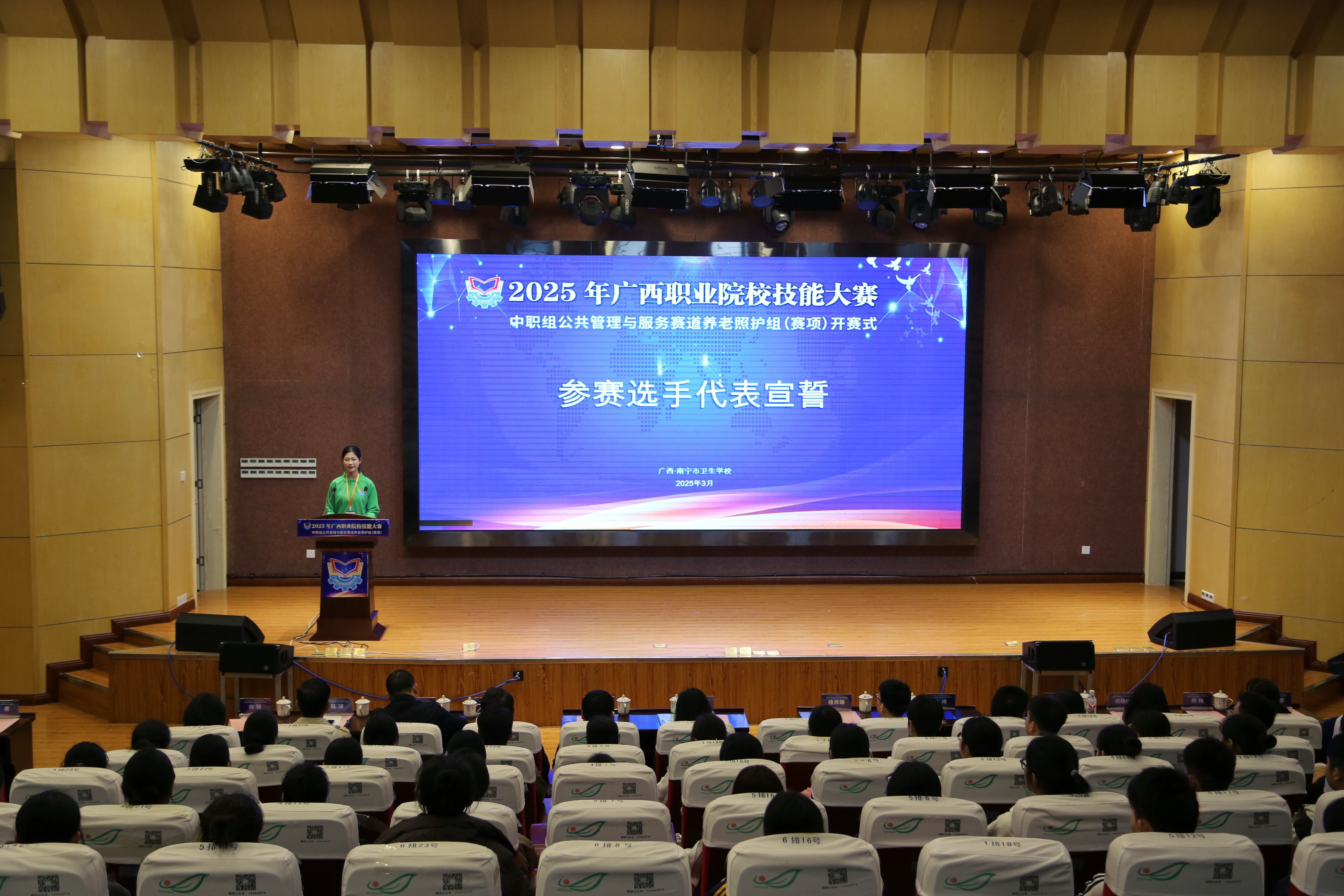 春风送暖,一派盎然。3月5日上午,2025年广西职业院校技能大赛中职组公共管理与服务赛道养老照护组(赛项)在南宁市卫生学校顺利开赛。南宁市卫生健康委员会三级调研员隆邦臻、南宁市卫生健康委员会老龄健康科科长蓝全祥,全区18所中职学校带队领导、指导老师及68名选手参加开赛式。开赛式由南宁市卫生学校副校长卢青主持。