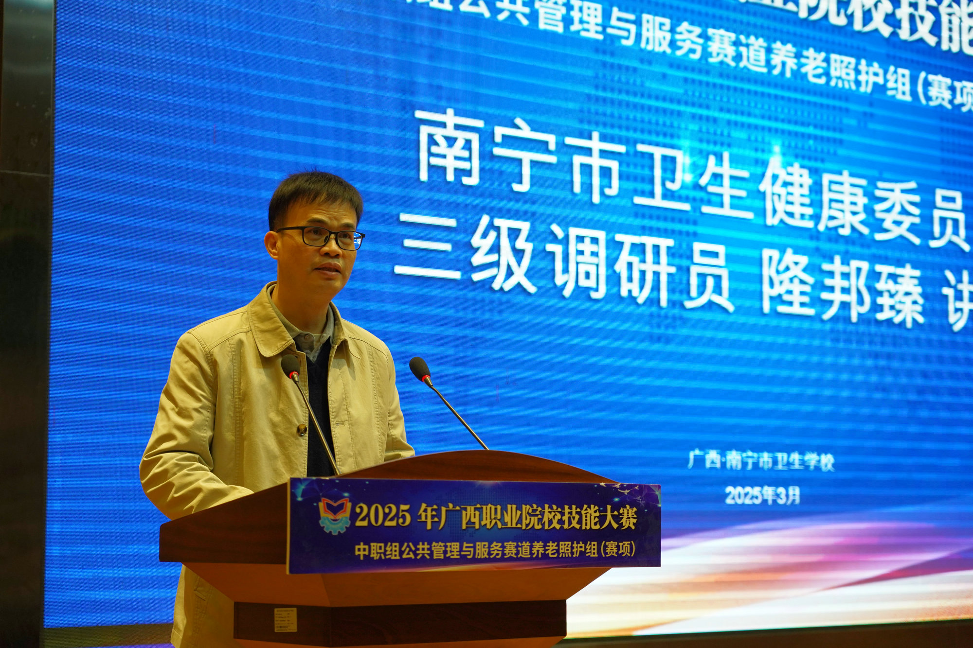 南宁市卫生健康委员会三级调研员隆邦臻在发言中对南宁市卫生学校赛项承办工作给予充分肯定。他指出,养老事业是社会发展中的重要组成部分,希望各参赛学校以赛促教、以赛促改,全面提升学生实践能力、创新能力,打造团队精神和人文精神,推动全区养老照护事业的蓬勃发展,为建设健康广西做出更大贡献。