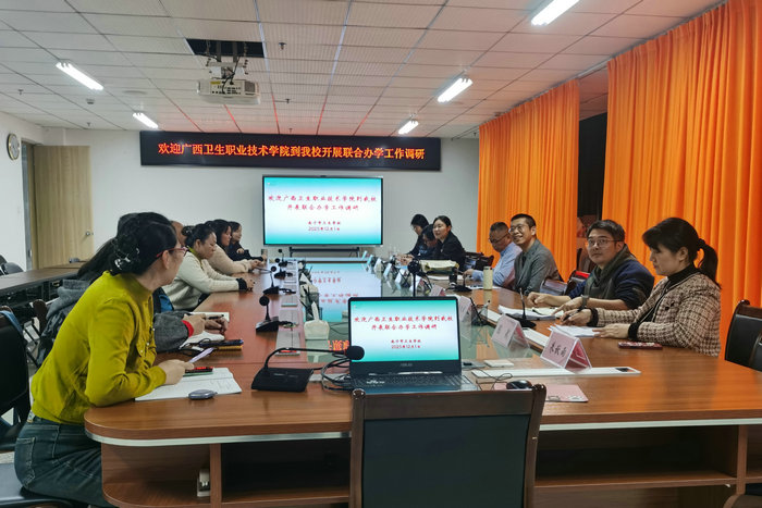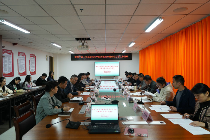12月1日,广西卫生职业技术学院组建专项调研团队,由教务处(校企合作办公室)副处长(副主任)龙玉惠、护理学院副院长汪涛带队,8名中层干部及相关工作人员共赴南宁市卫生学校,开展联合办学工作专项调研。南宁市卫生学校党委书记岑玉寒,党委副书记、校长曾伟,副校长卢青,相关中层干部及工作人员参加此次调研活动。